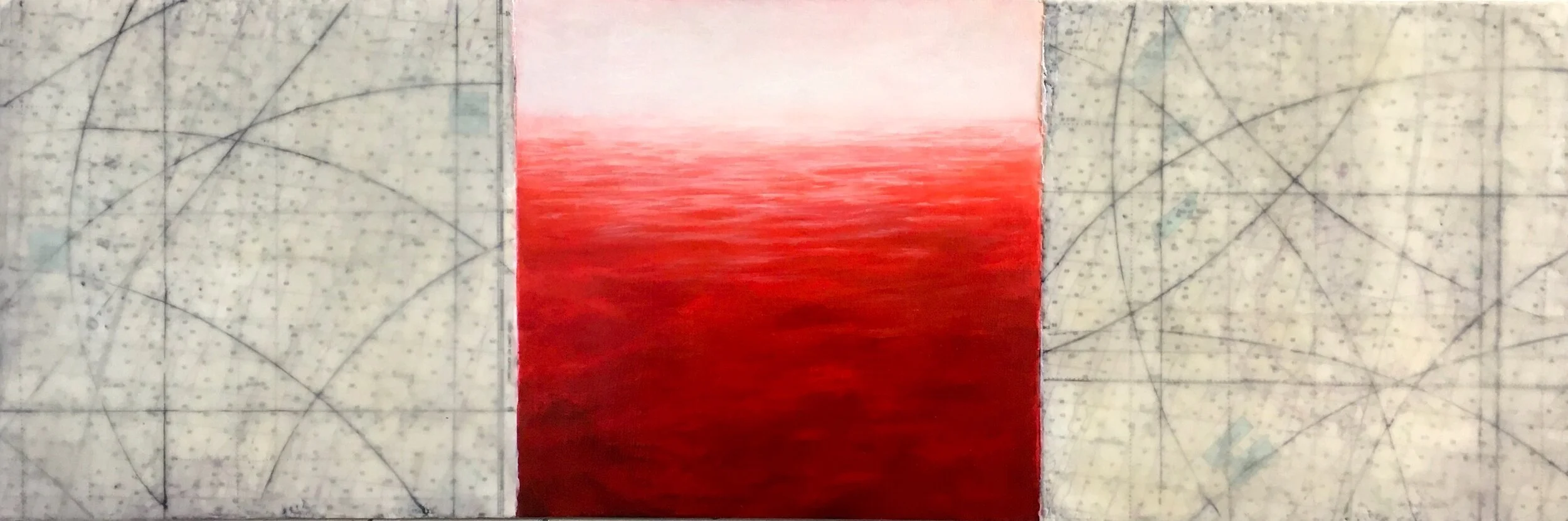 Uncharted, oil, nautical maps, encaustic on panel, 12x36"